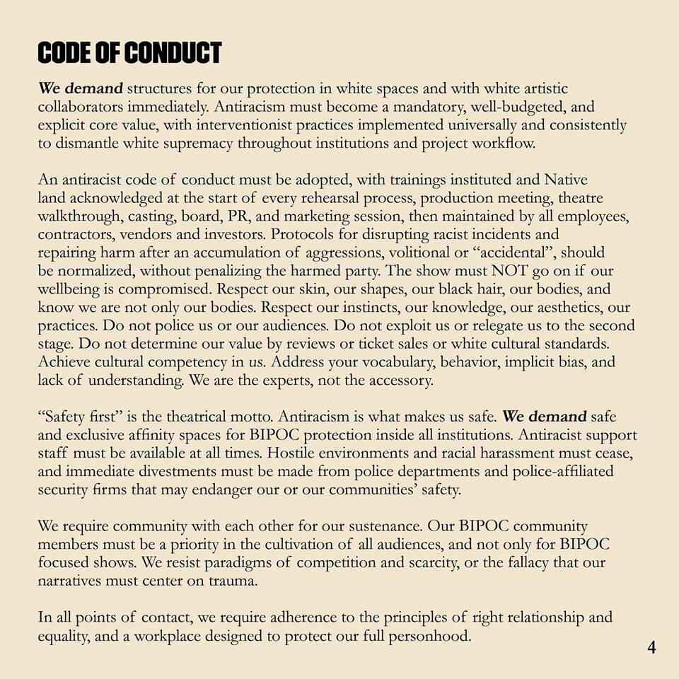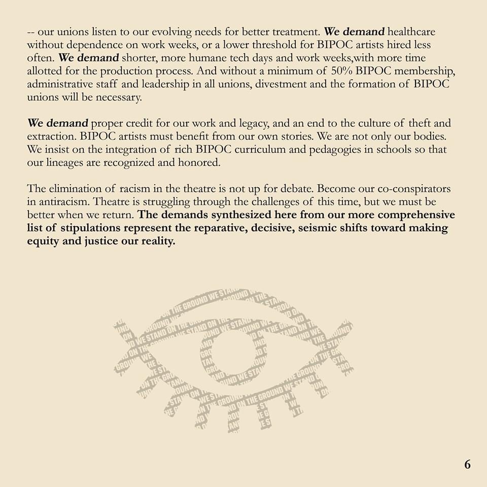 The demands. I would sum them up as the world is more than half BIPOC..something I wasn’t aware of .. so every single aspect of theater from theater education to every show(Broadway or no matter where) to producers to box office to concessions to critics to well, everybody, must be half of this group. No debate or discussion about that. Investors don’t have to be BIPOC, but they must disclose all of their financials for review from….. is there a BIPOC board or something that handles this? Is it to make sure, well, a show doesn’t gross like a billion dollars worldwide? I think that just recently happened. Is it to make sure only the right people are making money.. and if so, how much can they make? Are their families allowed to make money from royalties? Or should that all go to the cast?