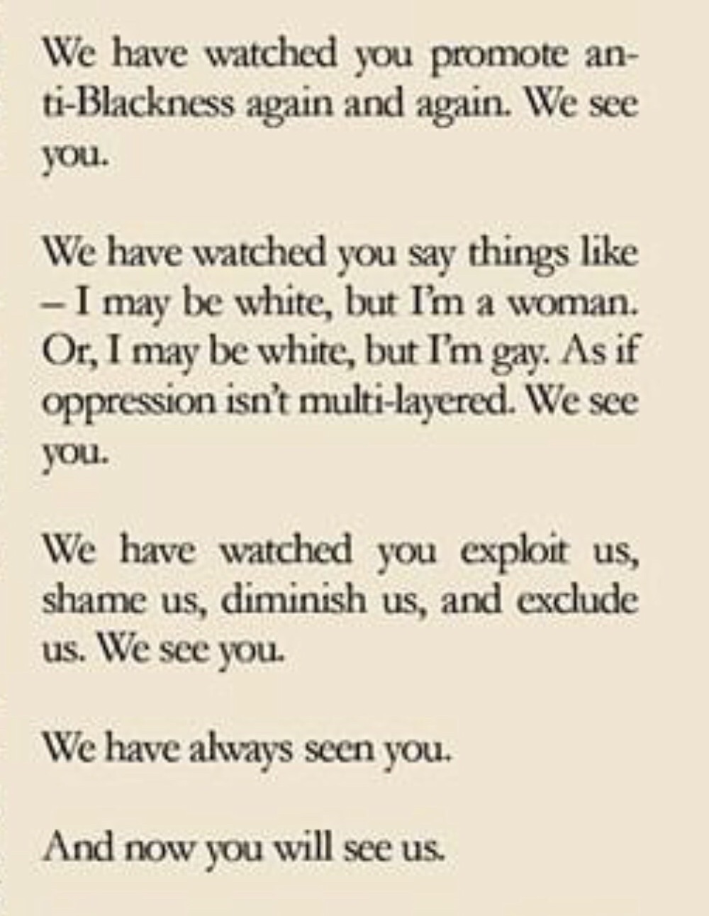 That is an excerpt from a manifesto called “We See You White American Theater”. This was followed by a list of demands to change theater. You know, make it more inclusive. More welcoming to all. It was signed by people of note in the industry including Lin-Manuel Miranda, Viola Davis, Lynn Nottage among many others.