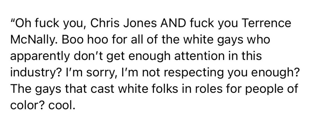 None of the privileged theater folk who actually had the nuts to attach their name to that screed or movement or whatever it is have recanted their statements… which means they still believe that gay white men are responsible for their suffering.