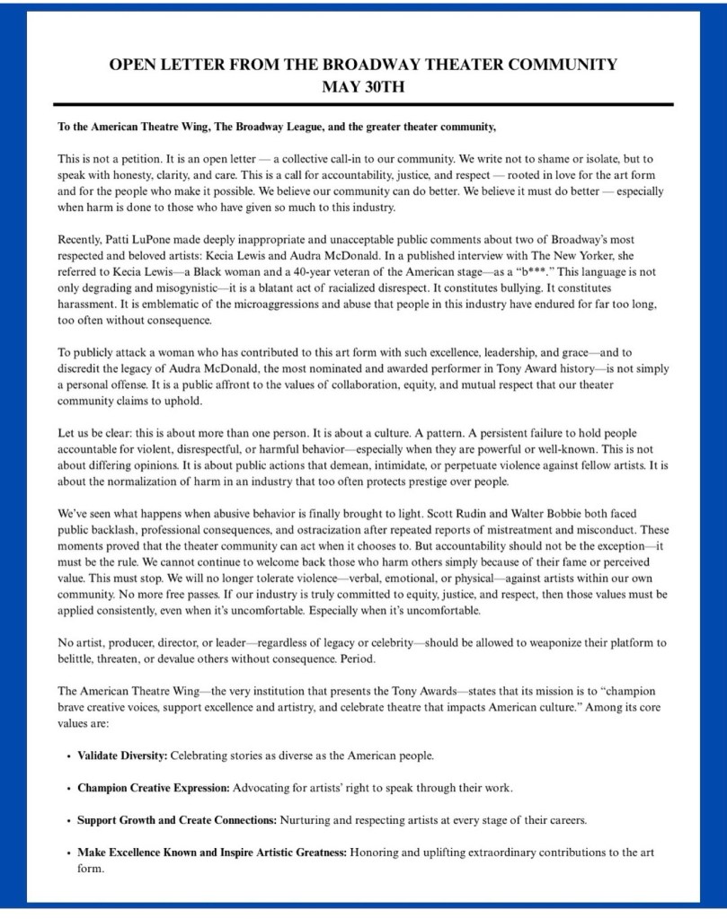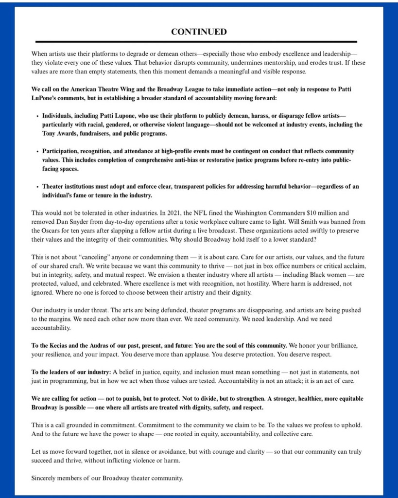 If the “Broadway Theater Community” actually represented the totality of actors on Broadway, or any other real group, with all the talk of inclusion and equity and courage and clarity and “needing each other”.. they would have done this: